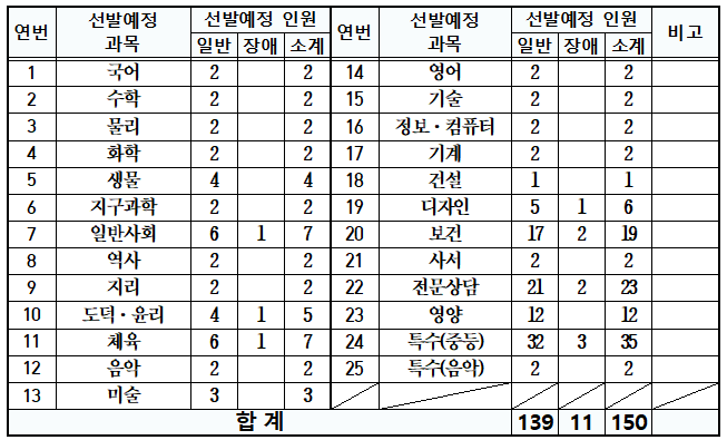 2022년 대구광역시 교육청은 25개 과목에서 150명을 선발하는데요. 특수(중등) 과목이 35명을 선발해 가장 티오가 많습니다.