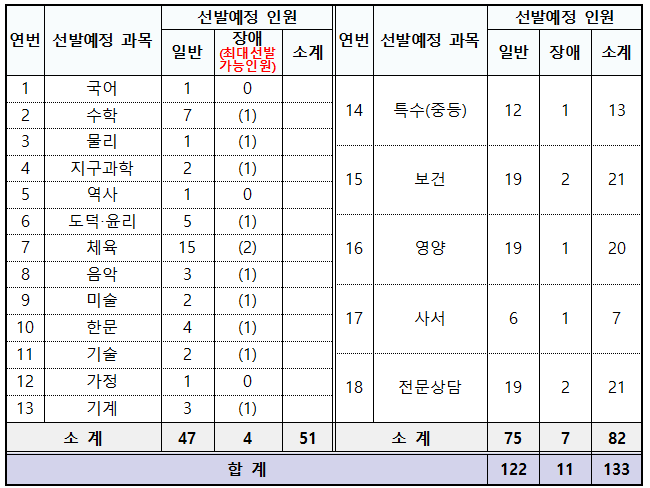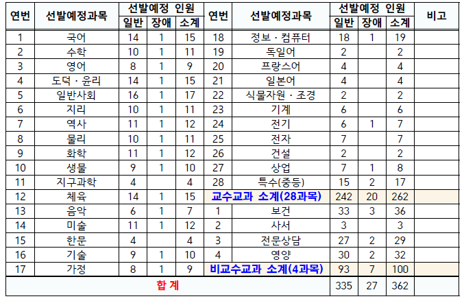 2022년 대전광역시 교육청은 18개 과목에서 133명을 선발하는데요. 전문상담과 보건 과목이 21명을 선발해 가장 티오가 많고 중등 교과목 중에서는 체육 과목이 17명을 선발해 티오가 많습니다.