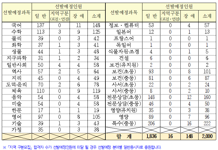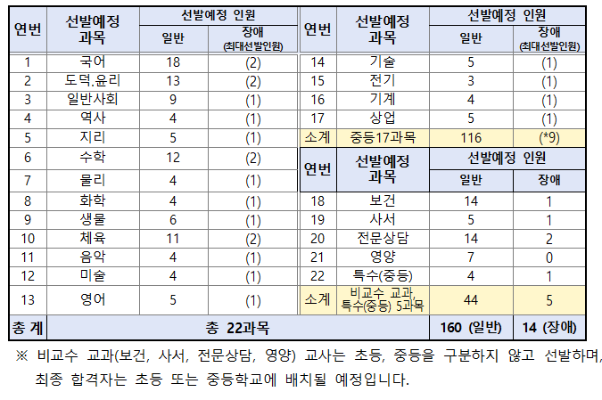 2022년 17개 교육청의 중등 임용고시 일반 모집, 장애인 구분 모집, 지역 또는 도서 구분 모집 인원은 아래 표와 같습니다.