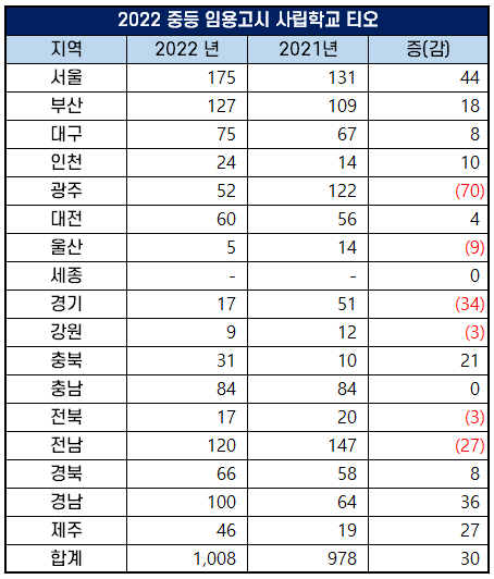 공립학교 뿐만 아니라 사립학교 중등 교원 티오도 증가했는데요. 2022년 전국의 사립학교 중등 교원 선발예정인원은 총 1,008명으로 2021년 978명보다 30명이 늘었습니다.