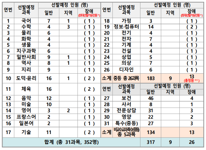 2022년 인천광역시 교육청은 31개 과목에서 352명을 선발하는데요. 특수(중등) 과목이 147명을 선발해 가장 티오가 많고 중등 교과목 중에서는 도덕·윤리 과목이 18명을 선발해 티오가 많습니다.
