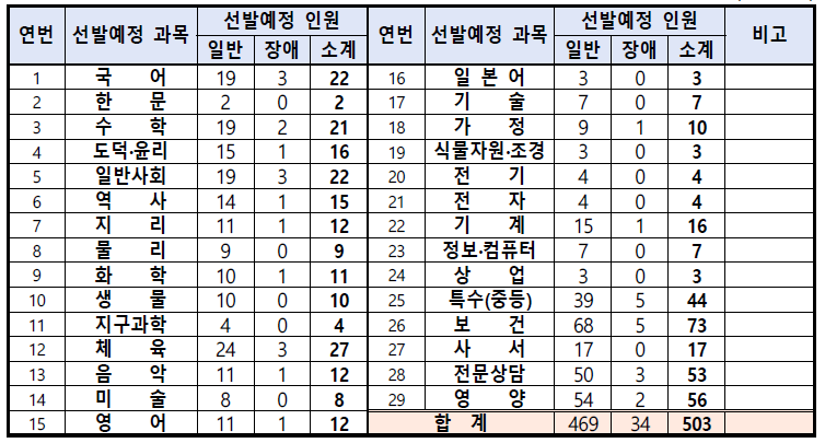 2022년 중등 임용고시 과목별 선발예정인원 정리 지난 포스팅에서 2022년 중등 임용고시 일정과 지역별 티오를 정리했었는데요. 이번 포스팅에서는 전국 17개 지역에서 중등 교원 선발 예정인원을