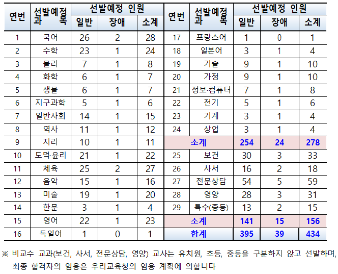 2022년 전라북도 교육청은 29개 과목에서 434명을 선발하는데요. 유치원, 초등, 중등을 구분하지 않고 선발하는 전문상담 과목이 59명, 영양 과목이 31명을 선발해 가장 티오가 많고 중등 교과목 중에서는 국어가 26명, 체육이 25명을 선발해 티오가 많습니다.