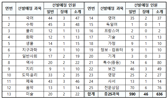 2022년 서울특별시 교육청은 25개 과목에서 636명을 선발하는데요. 특수(중등) 과목이 80명으로 가장 티오가 많고 중등 교과목 중에서는 수학이 45명, 국어가 44명, 체육이 43명으로 티오가 많습니다.