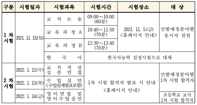 - 제2차(교수·학습 과정안 작성,교직적성 심층 면접, 수업실연, 영어 수업 실연 및 영업 면접 ) 시험일: 2022. 1. 12.(수) ~ 1. 14.(금)