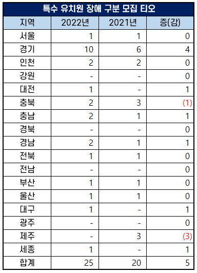 2022년 특수학교 유치원 교사 임용 고시 장애 구분 모집은 25명을 선발해 2021년 20명을 선발했던 것에 비해 티오가 5명 증가했습니다.