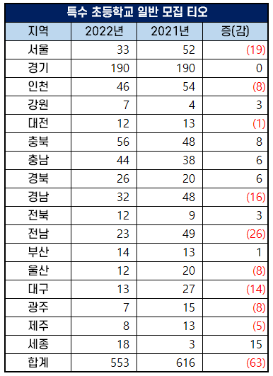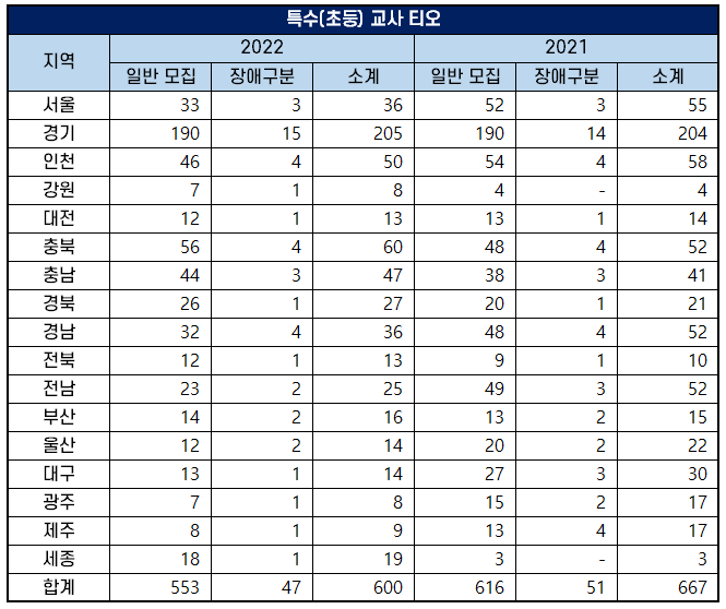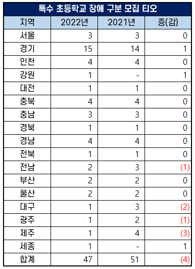 2022년 특수학교 초등 교사 임용 고시 장애 구분 모집은 47명을 선발해 2021년 51명을 선발했던 것에 비해 티오가 4명 감소했습니다.