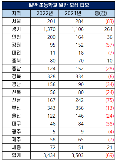 2022년 일반 모집 초등 임용 고시 티오는 3,434명으로 2021년 3,503명이었던 것에 비해 69명이 감소했습니다.