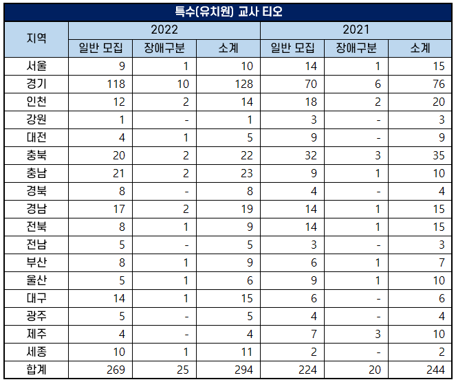 2022년 공립 특수학교(유치원) 교사 임용 고시 티오는 17개 지역에서 일반 모집으로 269명을, 장애 구분 모집으로 25명을 선발해 총 티오는 294명입니다. 2021년 일반 모집으로 224명을, 장애 구분 모집으로 20명을 선발해 총티오가 244명이었던 것에 비해 50명이 증가했습니다.