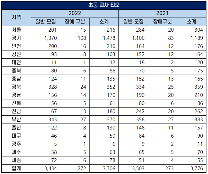 2022년 공립 초등학교 교사 임용 티오는 아래 표와 같은데요 17개 지역에서 일반 모집으로 3,434명을, 장애 구분 모집으로 272명을 선발합니다. 2021년 일반 모집으로 3,5034명을, 장애 구분 모집으로 273명을 선발해 총티오가 3,776명이었던 것과 비교하면 2022년 초등 임용 고시 티오가 70명 감소했습니다.