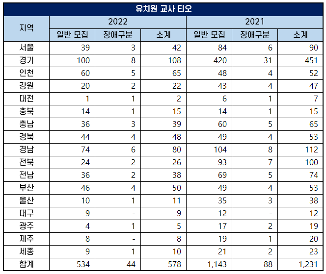 2022년 공립 유치원 교사 임용 고시 티오는 17개 지역에서 일반 모집으로 534명을, 장애 구분 모집으로 44명을 선발해 총티오는 578명입니다. 2021년 일반 모집으로 1,143명을, 장애 구분 모집으로 88명을 선발해 총티오가 1,231명이었던 것에 비해 653명이나 감소했습니다.