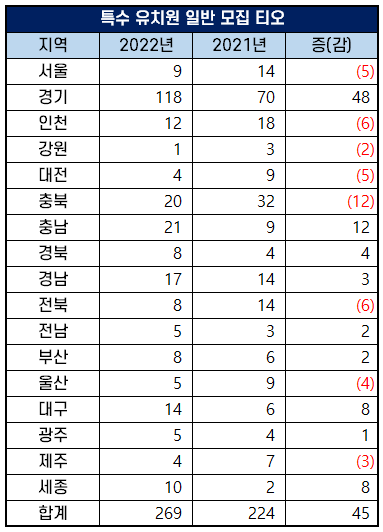 2022년 일반 모집 특수학교(유치원) 임용 고시 티오는 269명으로 2021년 224명이었던 것에 비해 45명이 증가했습니다.