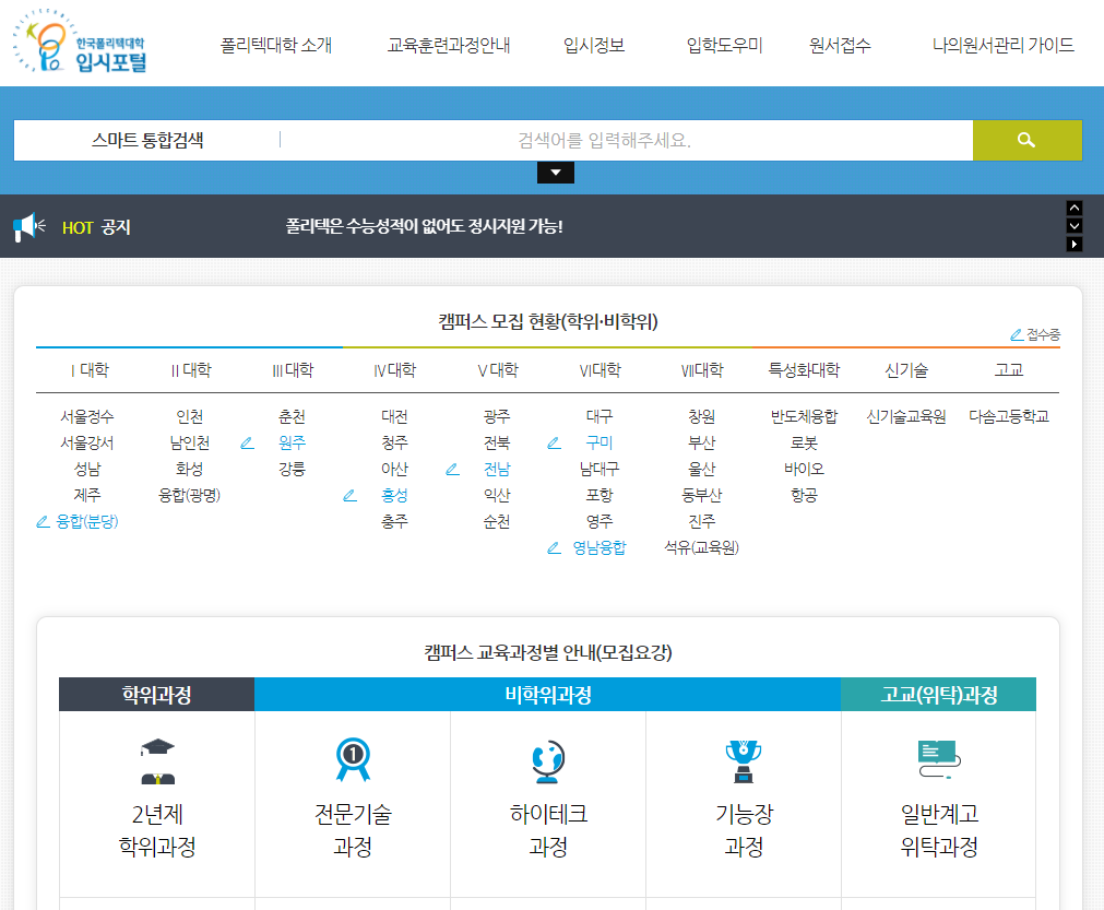 전문기술과정도 캠퍼스별로 전형 일정 및 모집인원과 모집학과 등이 다르니 한국폴리텍대학 입시포털에서 캠퍼스 별로 모집 요강을 검색해 보고 지원하기 바랍니다.