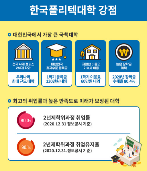 한국폴리텍대학은 전국에 41개의 캠퍼스에서 246개 학과를 운영하고 있는 대한민국에서 가장 큰 국책대학입니다. 한국폴리텍 대학은 학사 학위 과정 1학기 등록금이 130만 원 내외로 대한민국 최저 등록금 대학이며, 2020년 장학금 수혜율도 80.4%에 달하기 때문에 가장 저렴한 비용으로 학위를 취득할 수 있는 국내 대학입니다.