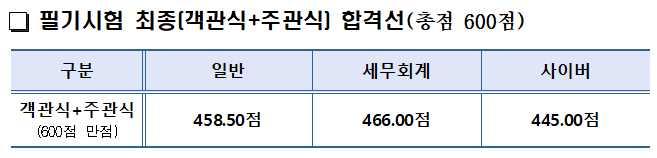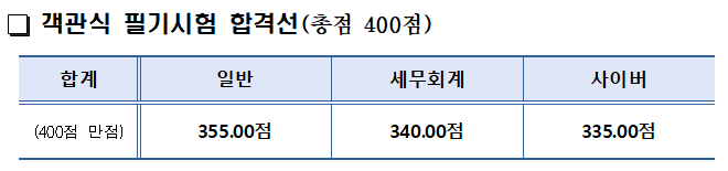 일반 분야 합격선은 355점으로 지난해보다 7.5점이 상승했고, 세무회계분야는 340점이 커트라인으로 지난해 317.5점보다 22.5점이나 크게 합격선이 상승했습니다. 사이버 분야도 지난해 325.0점이었던 합격선이 2022년에는 9.5점이 상승한 325.5점입니다.