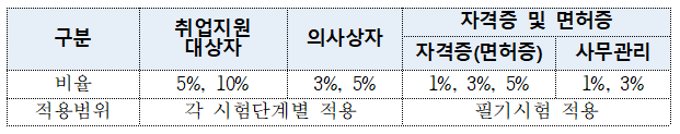 필기시험 시행 전일(2022년 1월 14일)까지 최종합격되어 유효한 자격증만 가점을 받을 수 있으며 필기시험 매과목 40% 이상 득점한 자에 한하여 필기시험의 각 과목별 만점의 일정 비율(1%, 3%, 5%) 점수를 가산합니다.