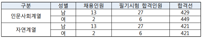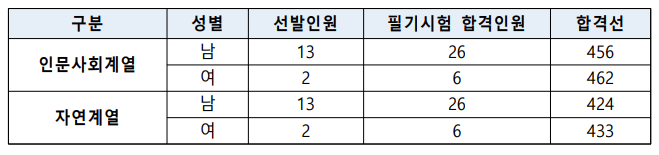 가장 경쟁률이 높고 치열했던 2021년 제27기 소방간부후보생 필기시험의 합격선은 아래 표와 같이 인문사회계열 남자가 456점, 여자가 462점이었고, 자연계열 남자가 424점, 여자가 433점이었습니다.