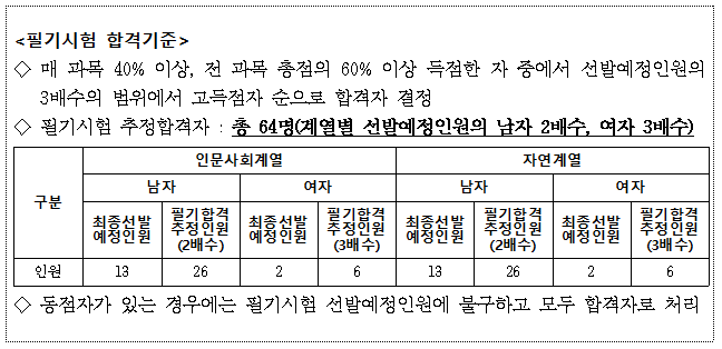 과목당 100점 만점 합계 500점 만점을 기준으로 합격자를 결정하는데 모든 과목 40점 이상을 득점한 자 중에서 고득점자 순으로 최종 선발예정인원의 2~3배수를 필기시험 합격자로 결정합니다.