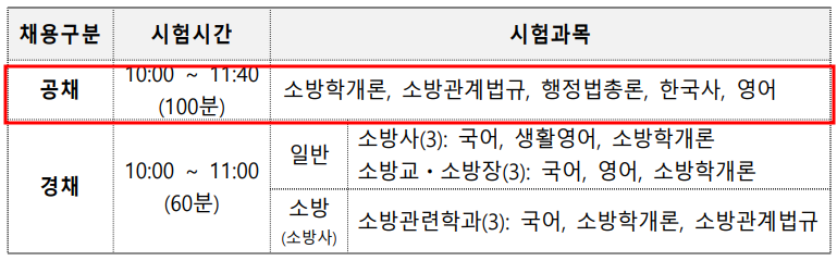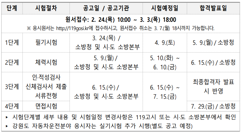 | 필기시험 | 3. 24.(목) / 소방청 및 시·도 소방본부 | 4. 9.(토) | 5. 9.(월)/소방청 |