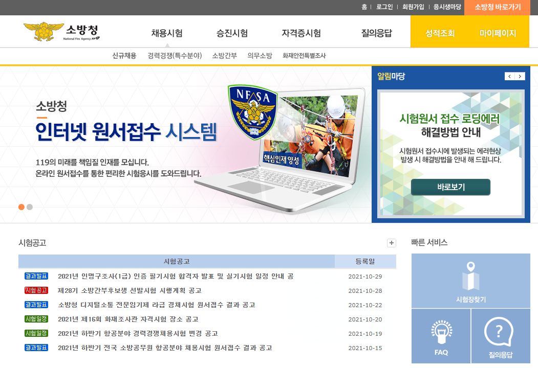 이로 인해 소방공무원 시험일정 공지 및 원서접수를 모두 소방청 인터넷 원서접수시스템(http://119gosi.kr)을 통해 진행하고 있습니다.