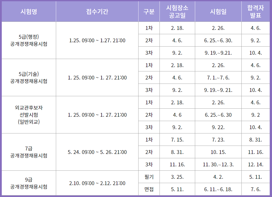 2022년도 국가공무원 공개경쟁채용시험 시행계획 공고 인사혁신처에서 시행하는 2022년도 국가공무원 5급·7급·9급 공개경쟁채용시험 및 외교관후보자 선발시험 계획이 공고되었습니다. 공고 파