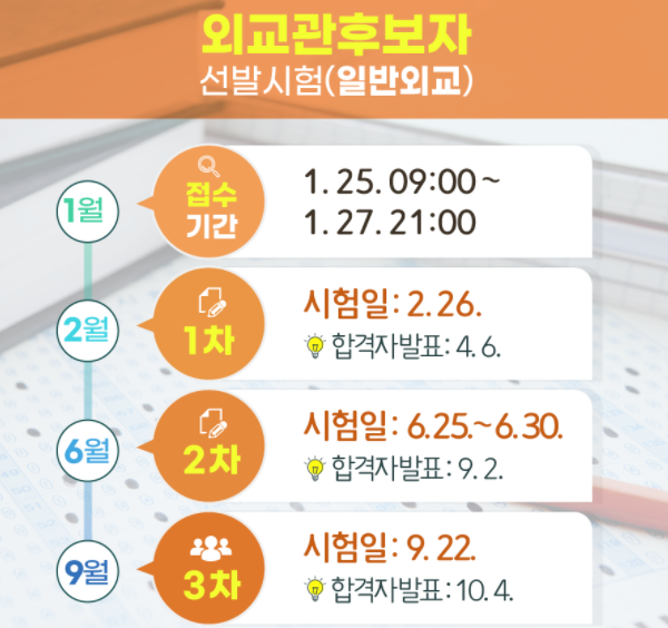 2022년 외교관후보자 선발 시험일정은 2022년 1월 25일(화) 원서접수로 시작되고 2022년 10월 4일(화) 최종합격자 발표로 마무리됩니다.