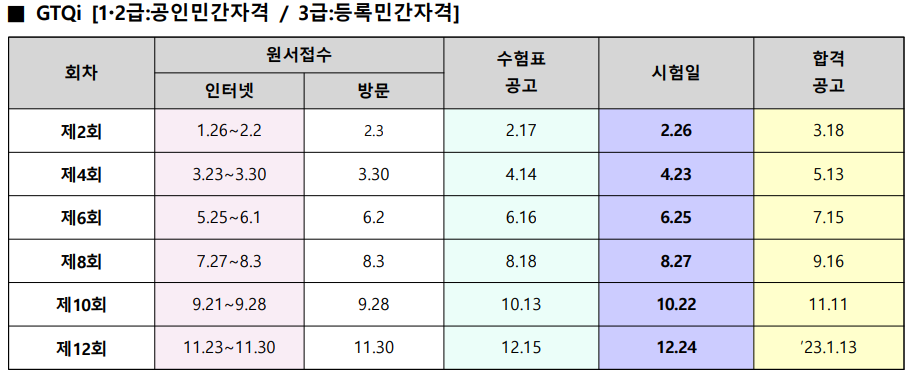 GTQi 자격시험은 12번의 GTQ 정기 시험 일정 중 2월, 4월, 6월, 8월, 10월, 12월의 짝수 달에만 시험을 실시하기 때문에 1년에 총 6회 시험을 시행하고 있습니다.