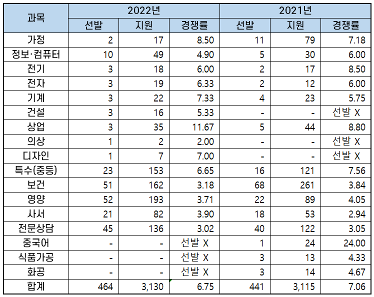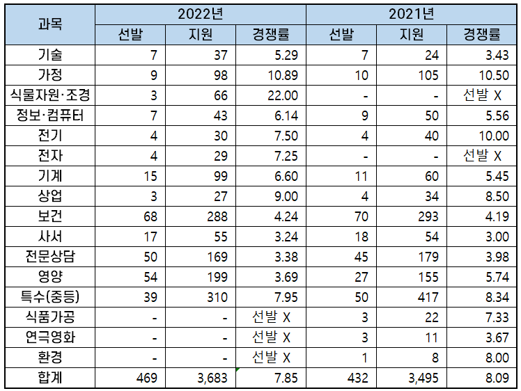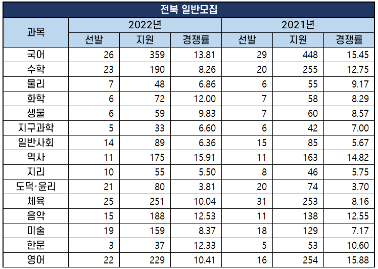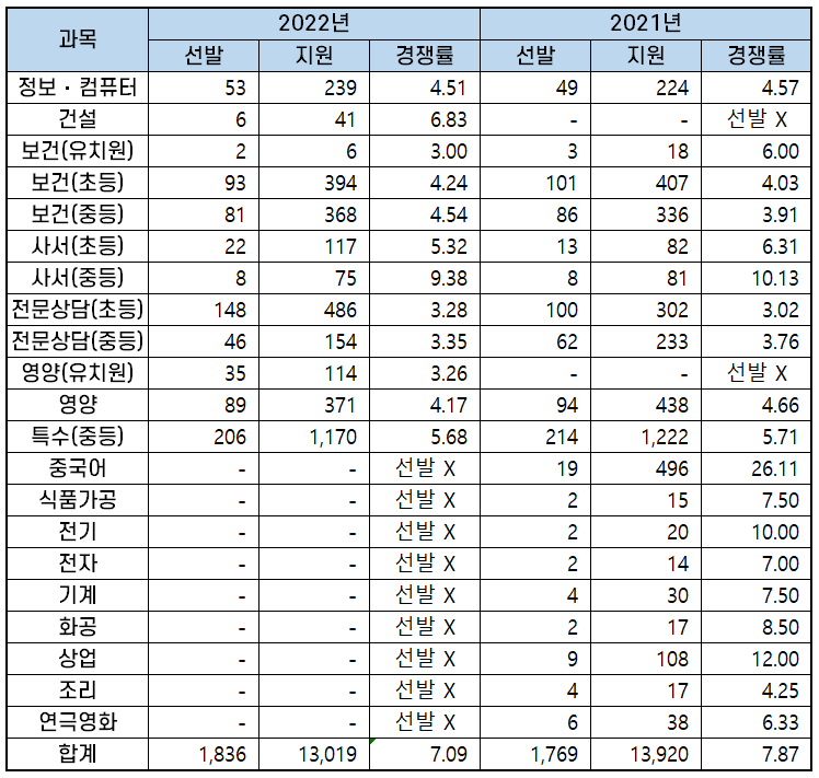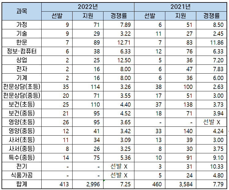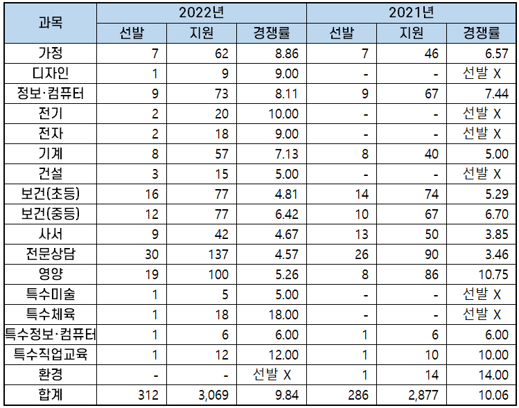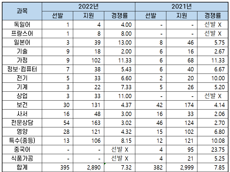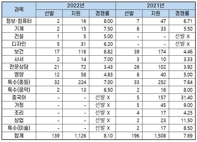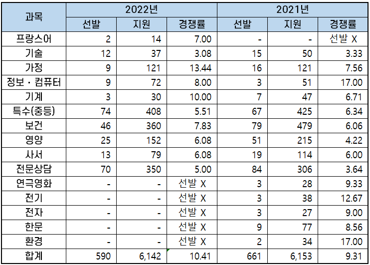 2022년 과목별 중등임용고시 경쟁률 분석
