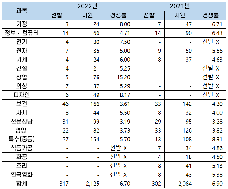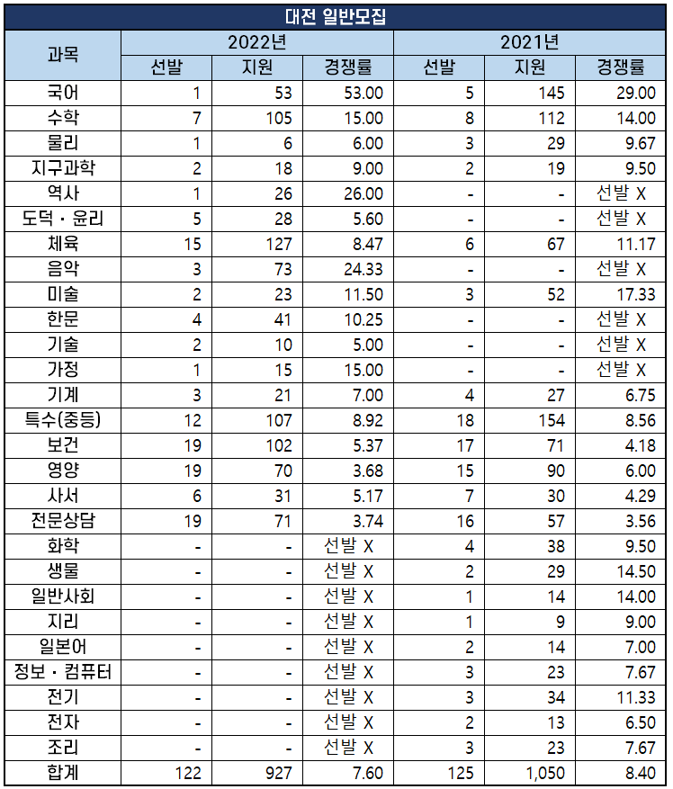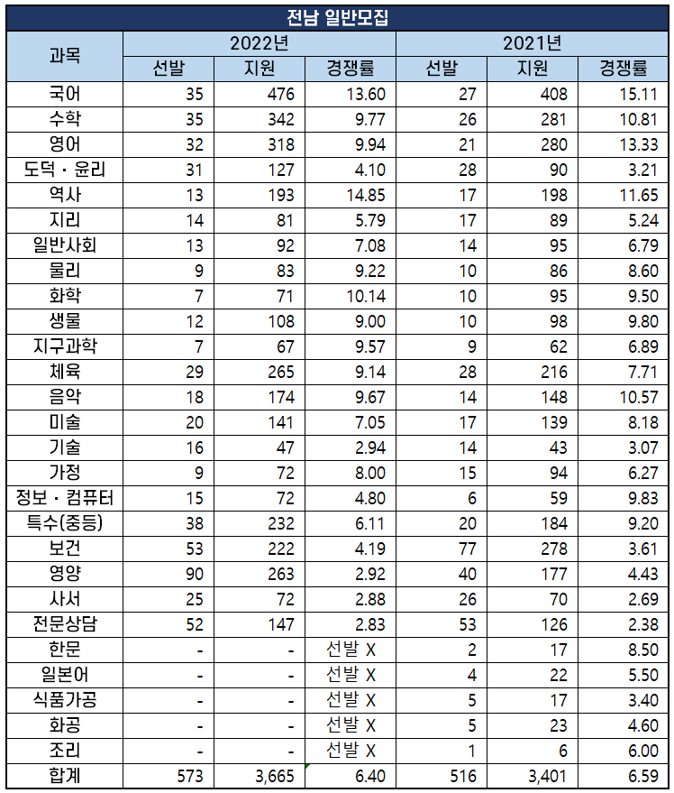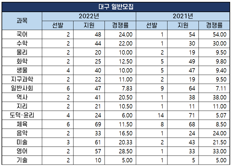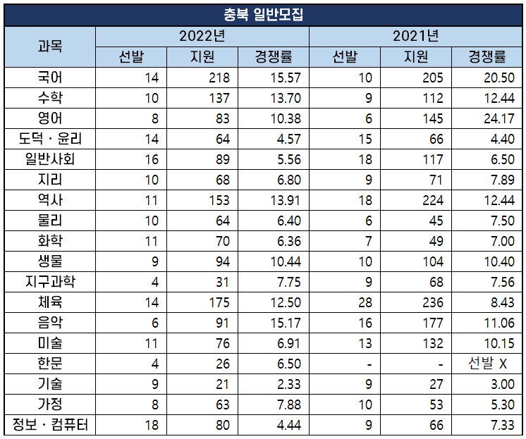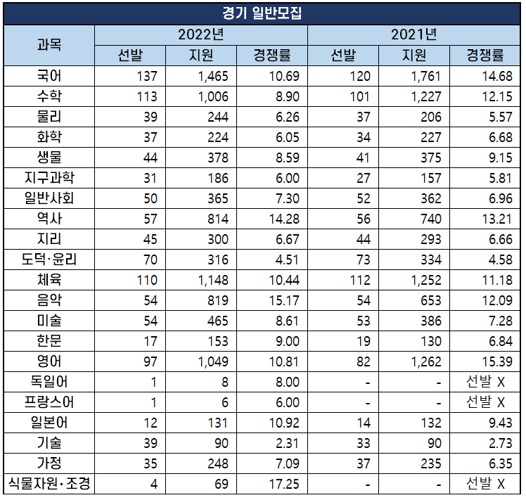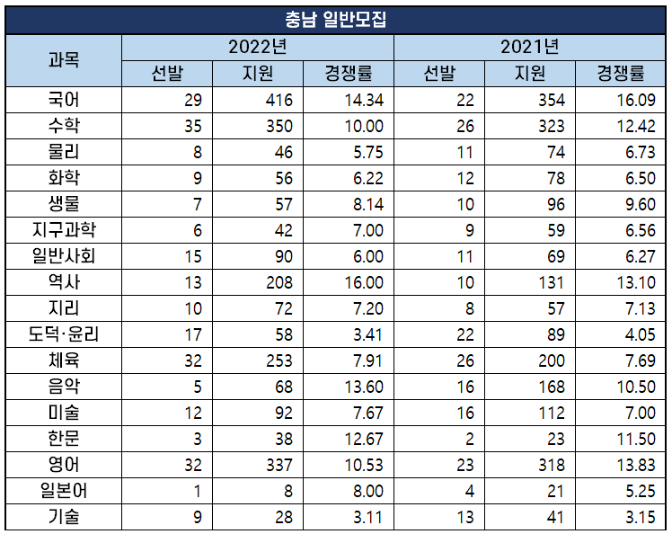2022년 과목별 중등임용고시 경쟁률 분석