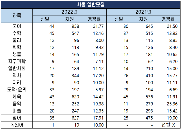 위에서 살펴본 것처럼 2022년 서울 중등임용고시 경쟁률이 가장 높은데요. 서울 지역 내에서는 국어 과목의 경쟁률이 가장 높았습니다. 44명을 선발하는 국어 과목에 958명이 지원해 21.77대 1의 경쟁률을 기록했습니다.