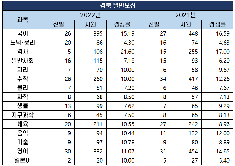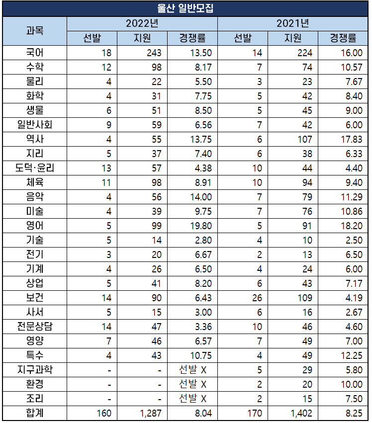 아래에서는 각 지역별 경쟁률을 2021년과 비교 정리했고, 17개 지역의 과목별 경쟁률 분석 자료는 별도로 포스팅했습니다.