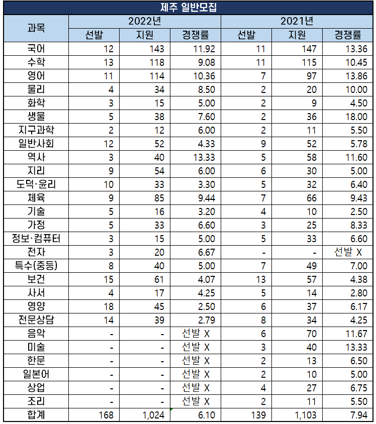 2022년 제주 중등임용고시는 일반모집으로 총 168명을 선발하는데 1,024명이 지원해 6.1대 1의 경쟁률을 기록했습니다.