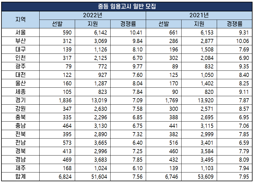 2022년 중등임용고시는 17개 시·도 교육청에서 일반모집으로 총 6,824명을 선발하는데 51,604명이 지원해 경쟁률은 7.56대 1을 기록했습니다. 지난 2021년 경쟁률이 7.95대 1었던 것과 비교하면 경쟁률이 소폭 하락했는데요. 선발인원6,746명에서 6,824명으로 증가한 반면, 지원인원은 53,609명에서 51,604명으로 하락했기 때문입니다.