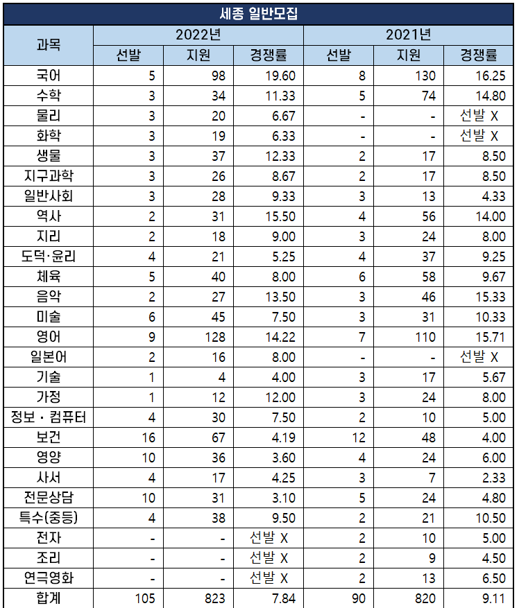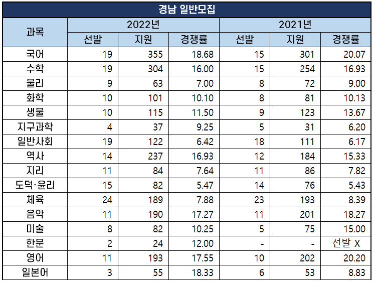 2022년 경남 중등임용고시는 일반모집으로 총 469명을 선발하는데 3,683명이 지원해 7.85대 1의 경쟁률을 기록했습니다.