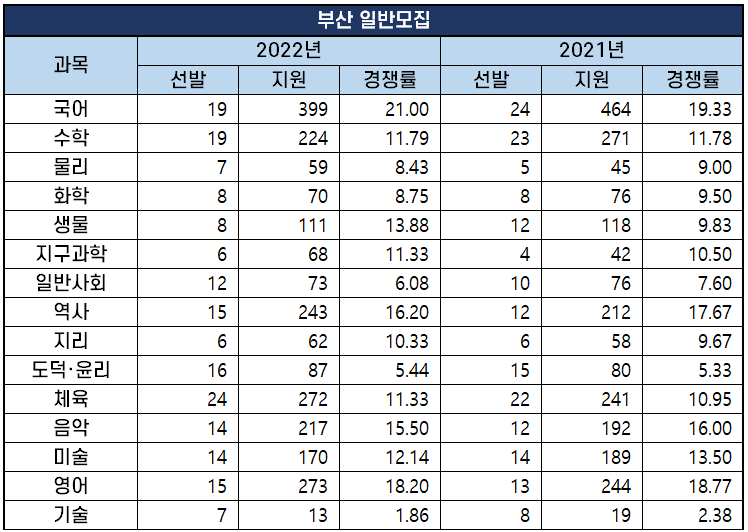 부산에서는 2021년에 이어 2022년에도 19명을 선발하는 국어에 399명이 지원해 21대 1로 가장 높은 기록을 기록했습니다.