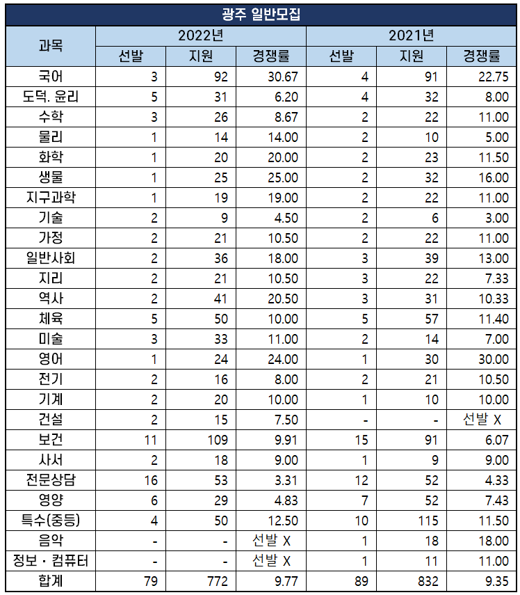 2022년 중등임용고시 경쟁률 과목별 비교 분석 전국 17개 시·도 교육청에서 시행하는 2022년 공립 중등학교 교사, 특수(중등), 보건, 영양, 사서, 전문상담교사 임용시험 최종 원서접수결과 및 지원