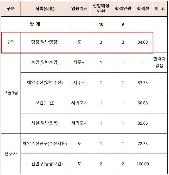 2021년 제주도 지방직 7급 공무원 공채는 일반행정 직렬에서만 선발을 했는데요. 3명을 선발하는데 281명이 지원해 93.67대 1의 경쟁률을 기록했고, 필기시험 합격선은 84.00점입니다.