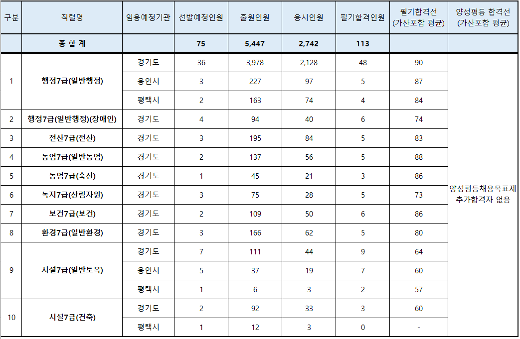 2021년 경기도 지방직 7급 공무원 공채는 일반행정, 전산, 농업(일반농업), 농업(축산), 녹지(산림자원), 보건, 일반환경, 시설(일반토목), 시설(건축) 9개 직렬에서 총 75명을 선발합니다.