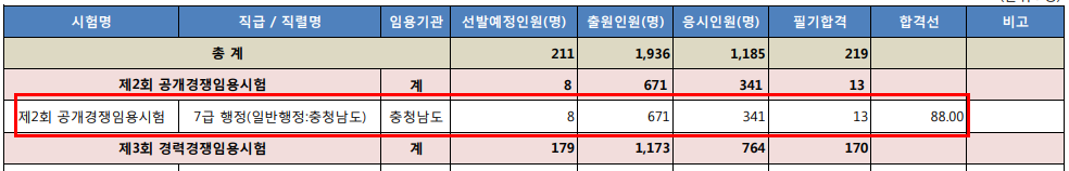 2021년 충청남도 지방직 7급 공무원 공채는 일반행정 직렬에서만 선발을 했는데요. 8명을 선발하는데 674명이 지원해 83.88대 1의 경쟁률을 기록했고, 필기시험 합격선은 88.00점입니다.