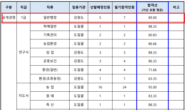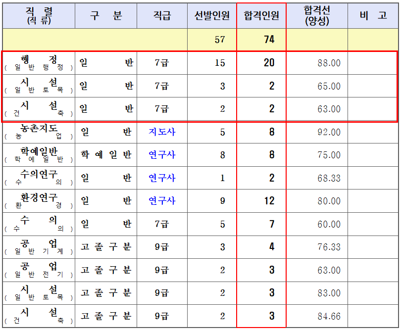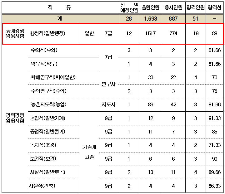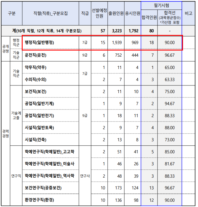 일반행정직은 15명을 선발하는데 1,005명이 지원해 67대 1의 경쟁률을 기록했고, 필기시험 합격선은 88.00점입니다.