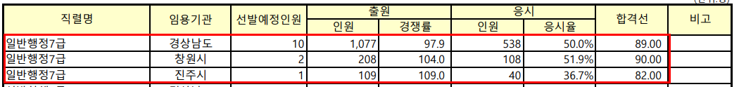 2021년 경상남도 지방직 7급 공무원은 일반행정 직렬에서만 선발을 했는데요. 경상남도가 임용하는 지방직 공무원 10명을 선발하는데 1,077명이 지원해 107.7대 1의 경쟁률을 기록했고, 필기시험 합격선은 89.00점입니다.