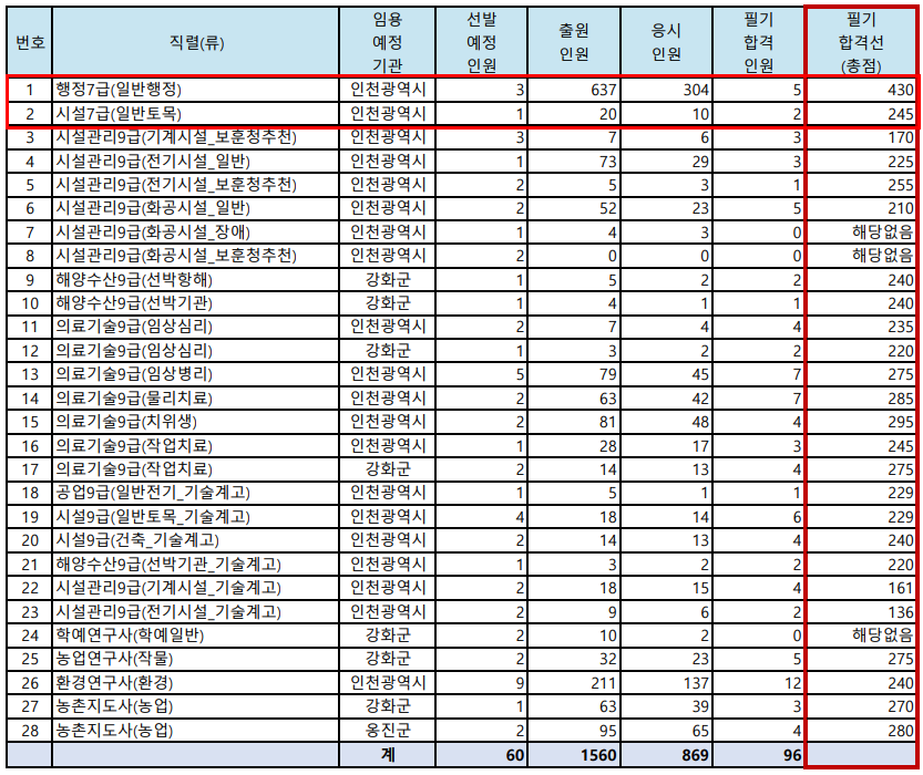 2021년 인천시 지방직 7급 공무원 공채는 행정직에서 일반행정 직렬, 기술직에서 시설(일반토목)의 2개 직렬에서 채용을 했는데요.