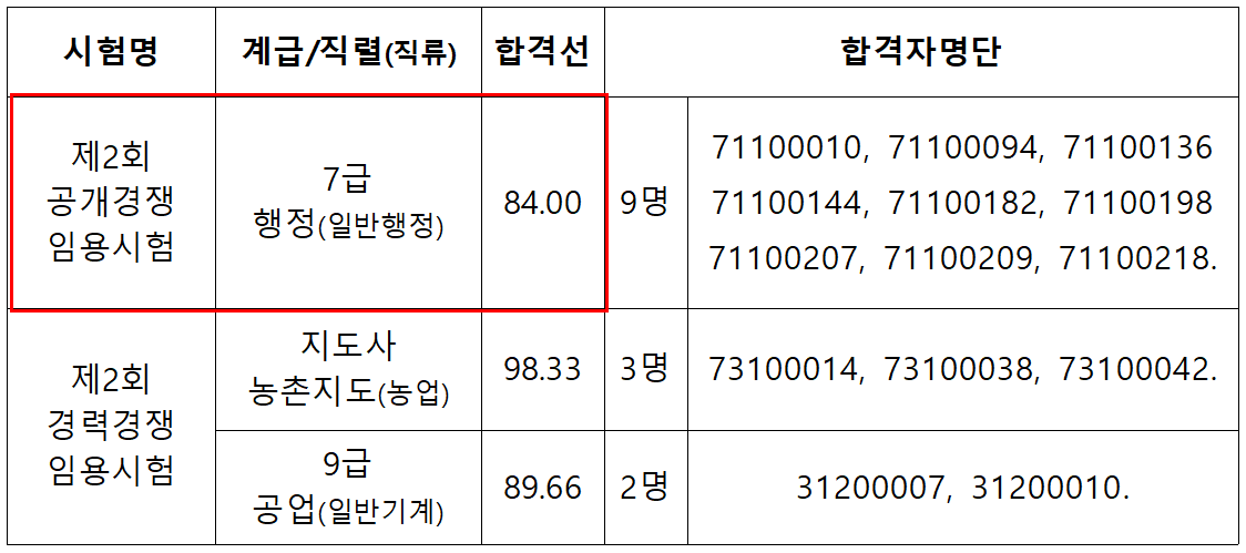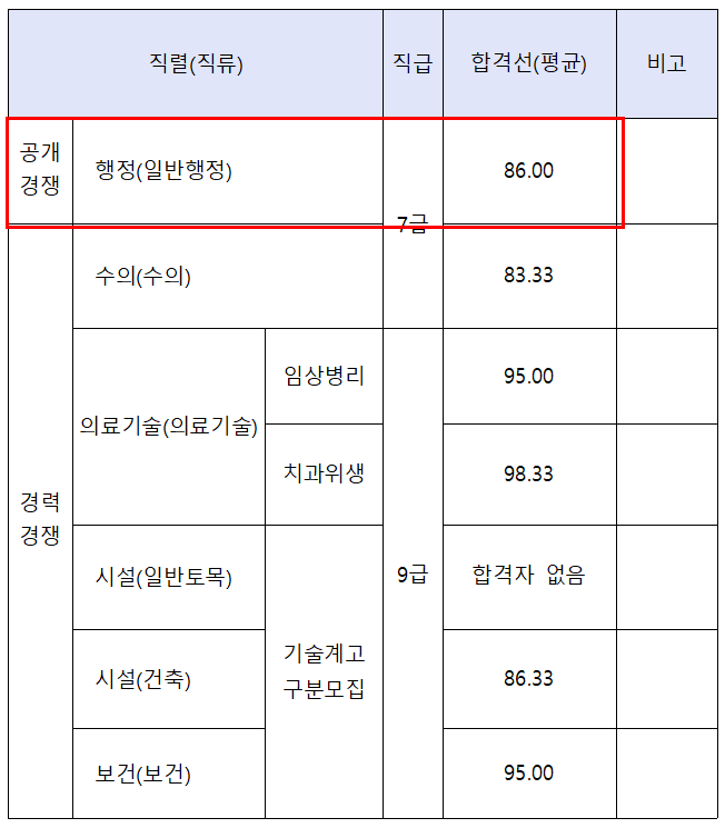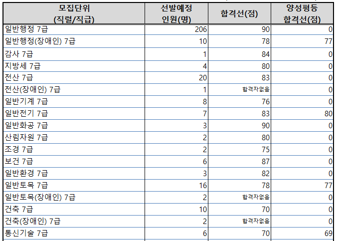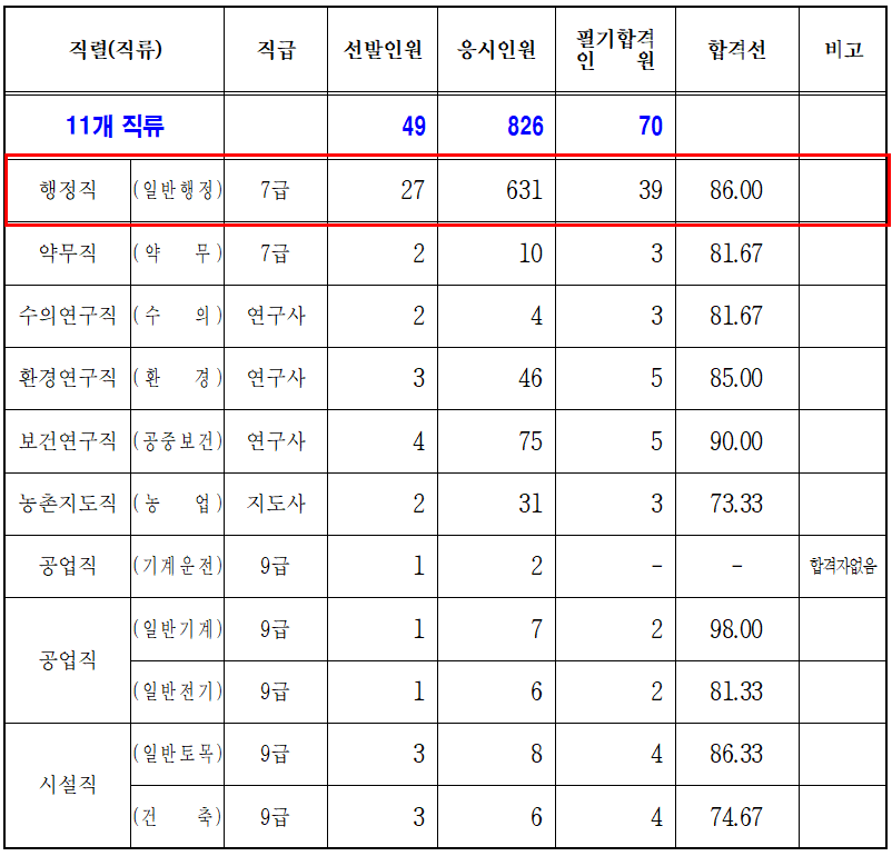 일반행정직은 3명을 선발하는데 637명이 지원해 212.33대 1의 높은 경쟁률을 기록했고, 필기시험 합격선은 86.00점(총점 430점)입니다.