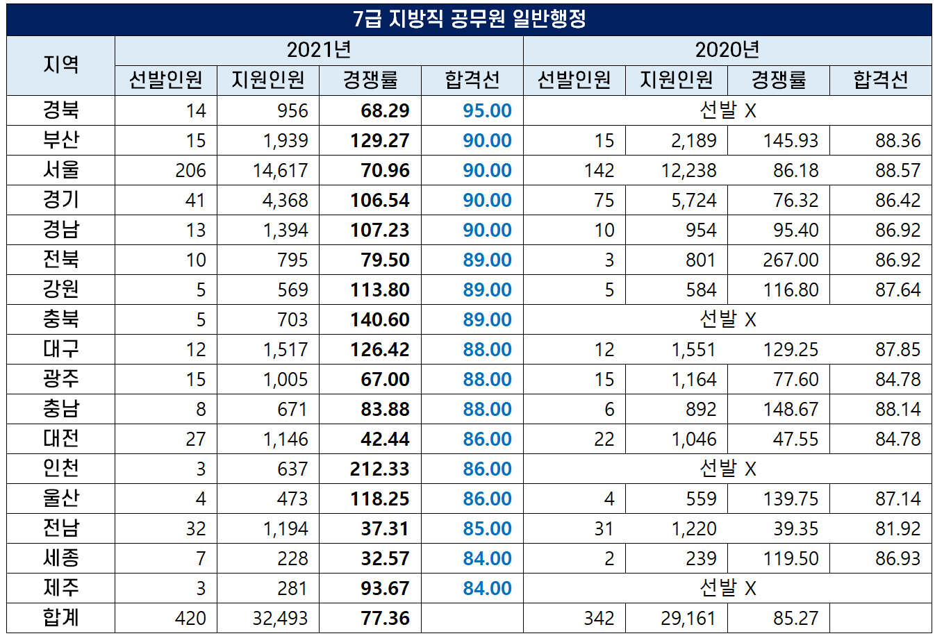 2021년 서울시 7급 합격선 (+ 직렬별 경쟁률 비교 정리)