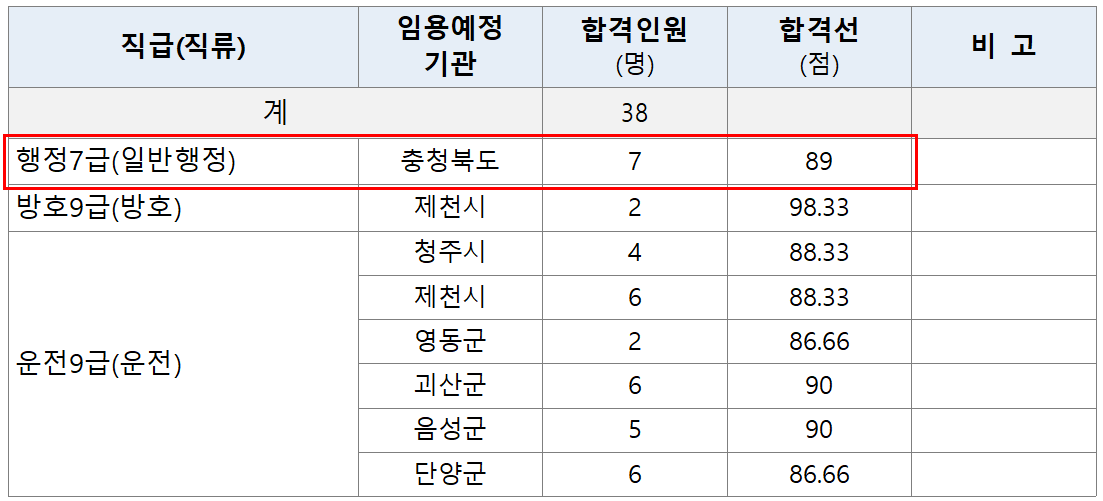 2021년 충청북도 지방직 7급 공무원 공채는 일반행정 직렬에서만 선발을 했는데요. 5명을 선발하는데 703명이 지원해 140.6대 1의 경쟁률을 기록했고, 필기시험 합격선은 89.00점입니다.