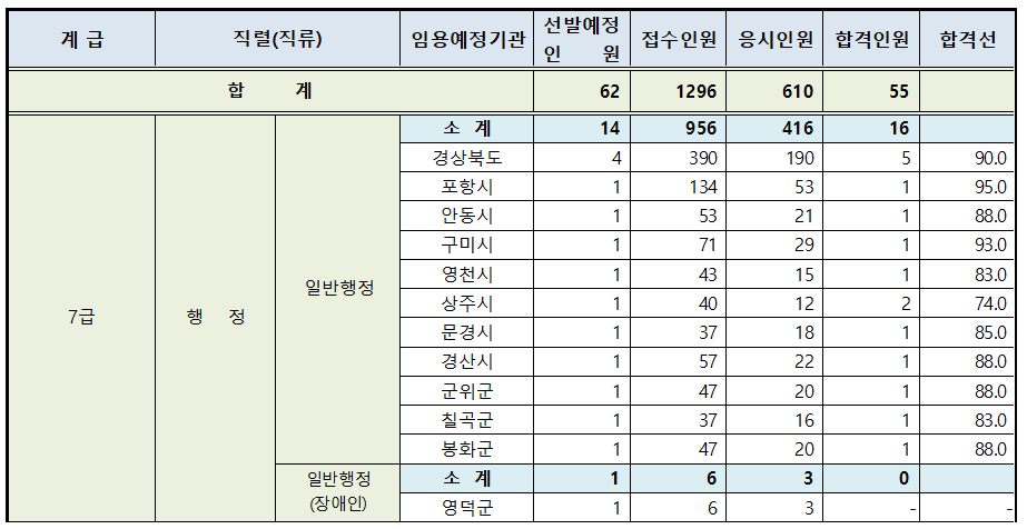 2021년 경상북도 지방직 7급 공무원은 일반행정 직렬에서만 선발을 했는데요. 경상북도가 임용하는 지방공무원은 4명을 선발하는데 390명이 지원해 97.5대 1의 경쟁률을 기록했고, 필기시험 합격선은 90.00점입니다.