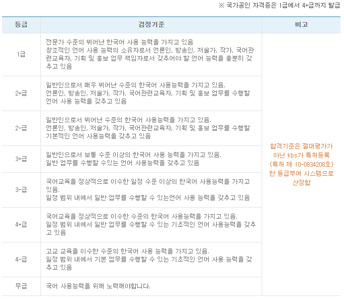 KBS한국어능력시험은 성적에 따라 1급, 2+급, 2-급, 3+급, 3-급, 4+급, 4-급, 무급의 총 8개 자격 등급으로 구분하는데요.