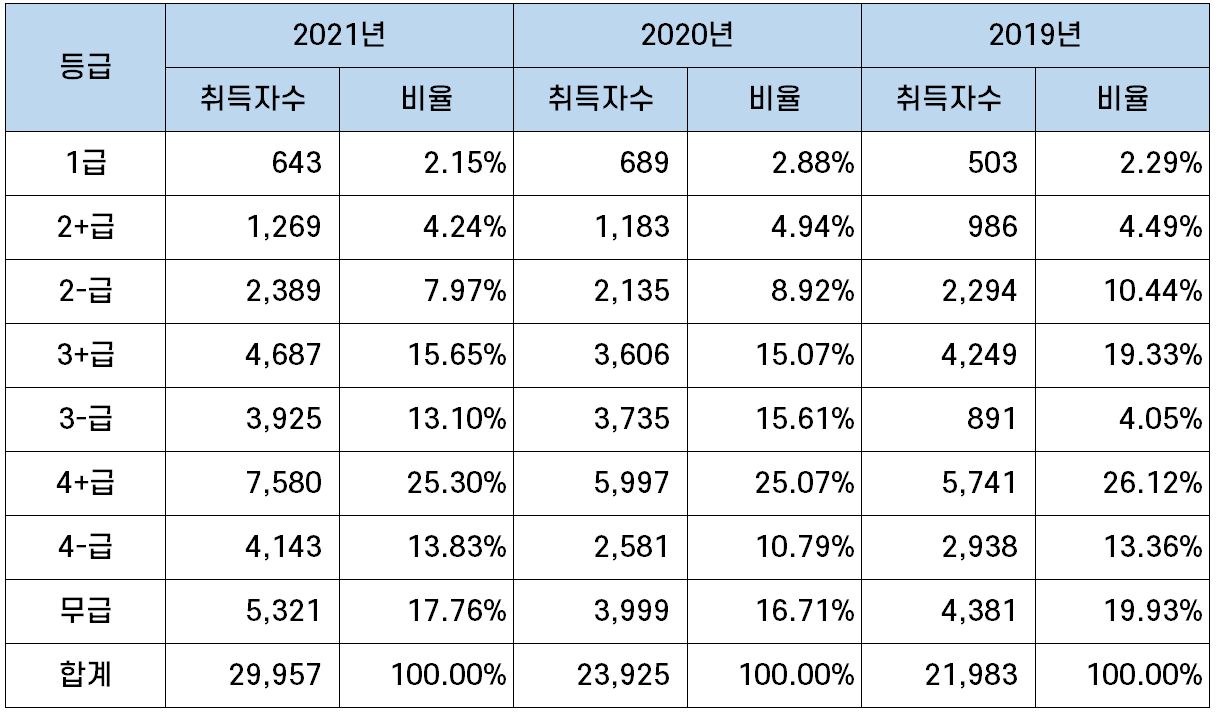 | 1급 | 643 | 2.15% | 689 | 2.88% | 503 | 2.29% |