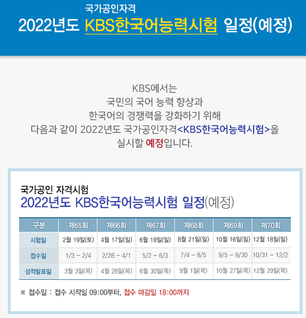 2021년보다 시험 응시기회가 많아진 만큼 2022년에 KBS한국어능력시험에 응시하는 수험생은 수험 계획을 잘 세워 보다 높은 등급을 받으시길 바랍니다.