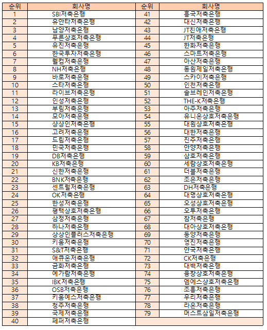 좋은 저축은행 1위부터 79위까지 순위는 다음과 같습니다.